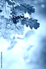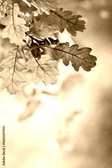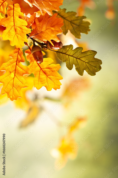 Close up of oak tree branch with yellow and green leaves and acorns. Concept of autumn and the beauty of nature