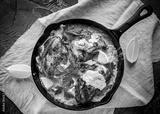 Creamy chicken fellets supremes in mushroom sauce with parsley In rustic cast iron skillet.