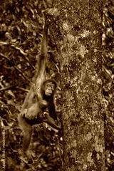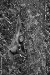 Mother and the baby orangutans hanging from the tree in Sepilok, Borneo, Malaysia