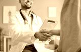 Portrait of happy smiling young friendly male doctor shaking hands with woman greeting his patient sitting in medical clinic. Physician working in office. Medicine and health care concept.