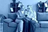 Smiling young woman caregiver sitting on couch beside elderly female in glasses, helping her with modern smartphone, explain medical application usage. Home support, digital guidance in senior care