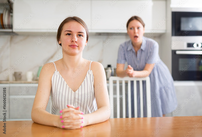 Upset daughter is sitting at table. Mom yells at her daughter in the background