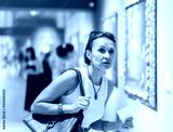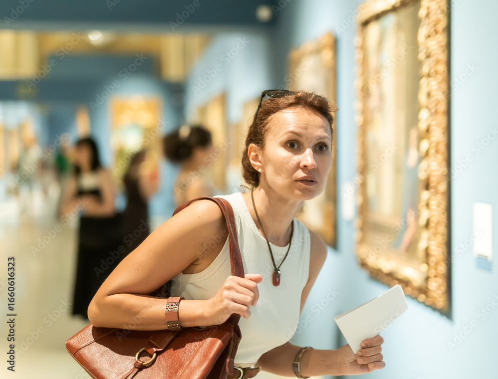 Portrait of pretty young woman visitor with paper guide at exhibition of paintings in light museum