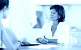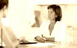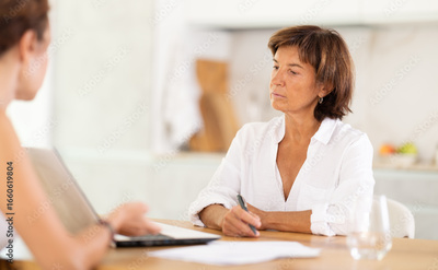 Woman listen attentively and intently to female of seller, who tells about advantages of making microloan in credit institution
