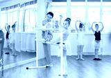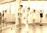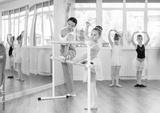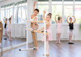 Ballet pose grand batman - little girls at a choreography lesson are learning ballet movements in the studio