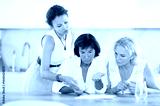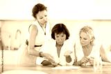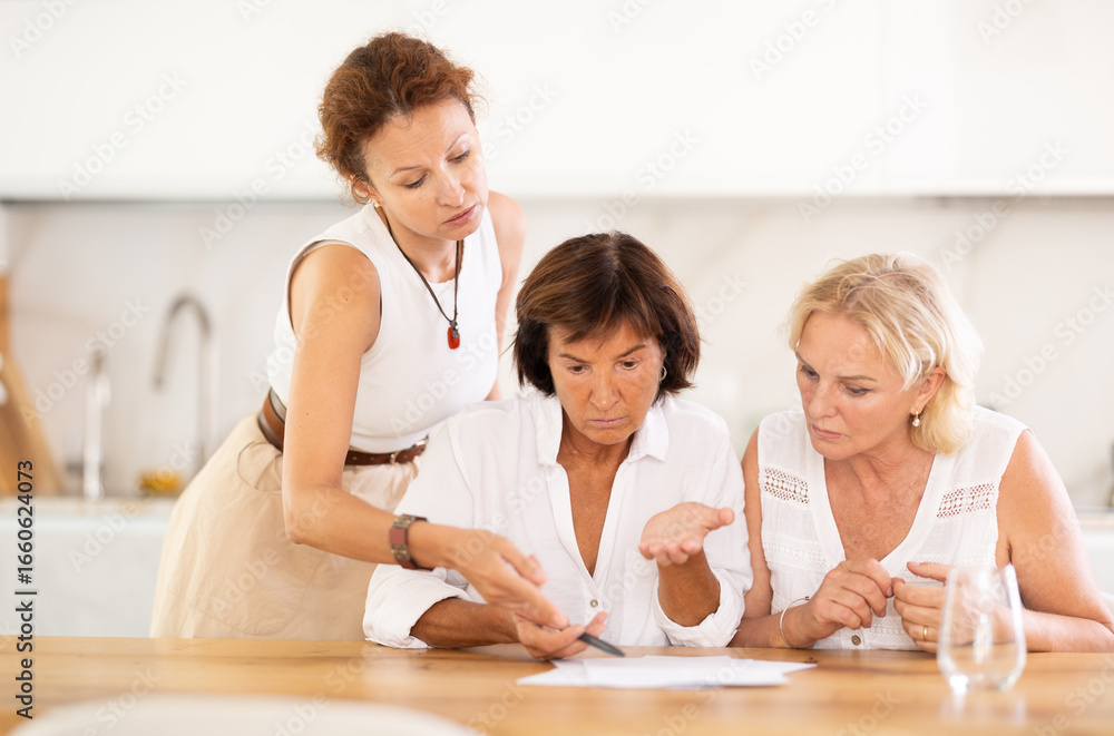 Three friends try to solve financial problems together by discussing documents in the kitchen of their home