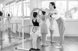 In ballet studio woman teacher conducts class and correct body posture during girls engaged perform repetitions of elements and tasks, doing first position near ballet bare