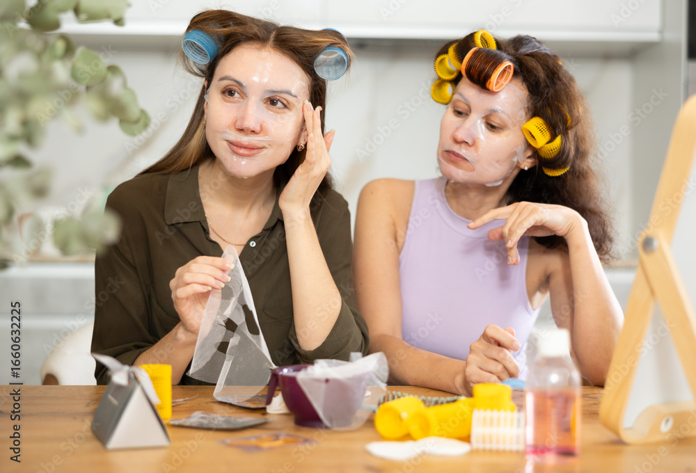 Two interested adult women testing out hydrating face paper mask during daily self-care routine, sharing thoughts on skincare experiences in cozy home environment