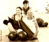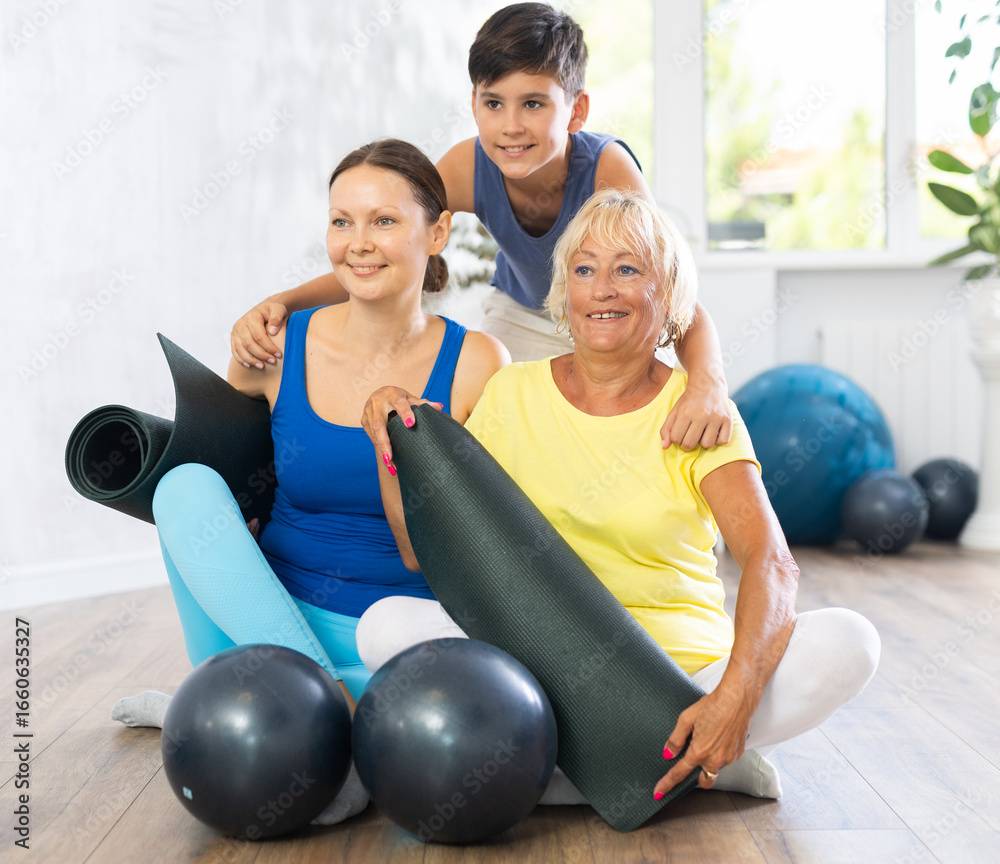 Shot of three generation family posing sitting with softballs and sports equipment. Mother, grandmother and adolescence son in gym