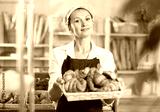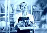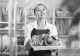 Smiling female baker in white uniform stands behind counter in small private bakery offering hot croissants