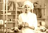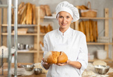 Bakery woman employee holds ready-made loafs of breads. She stands against background of bakerys desktop, flour, dough and improvised tools lie on work surface of countertop
