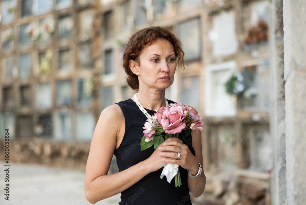 Elegant grieving woman in forties, wearing formal black dress and pearls, standing with bouquet in hands near stone columbarium wall in cemetery, gazing sorrowfully and contemplating loss