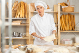 Positive female baker preparing pizza dough in bakery