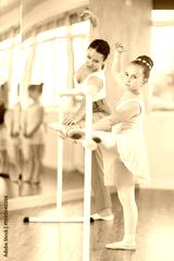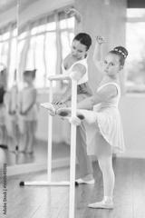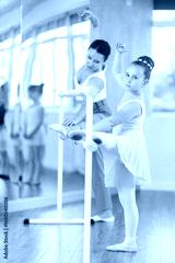 Adult woman teacher helps girl dancer stretch at ballet barre in studio