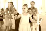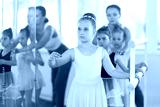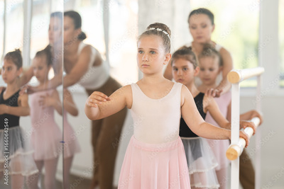 Group of ballerinas preparing for performance, learning and improving quality of rendering stage. Ballerinas near ballet bare repeat forth position with supervision experienced female mentor