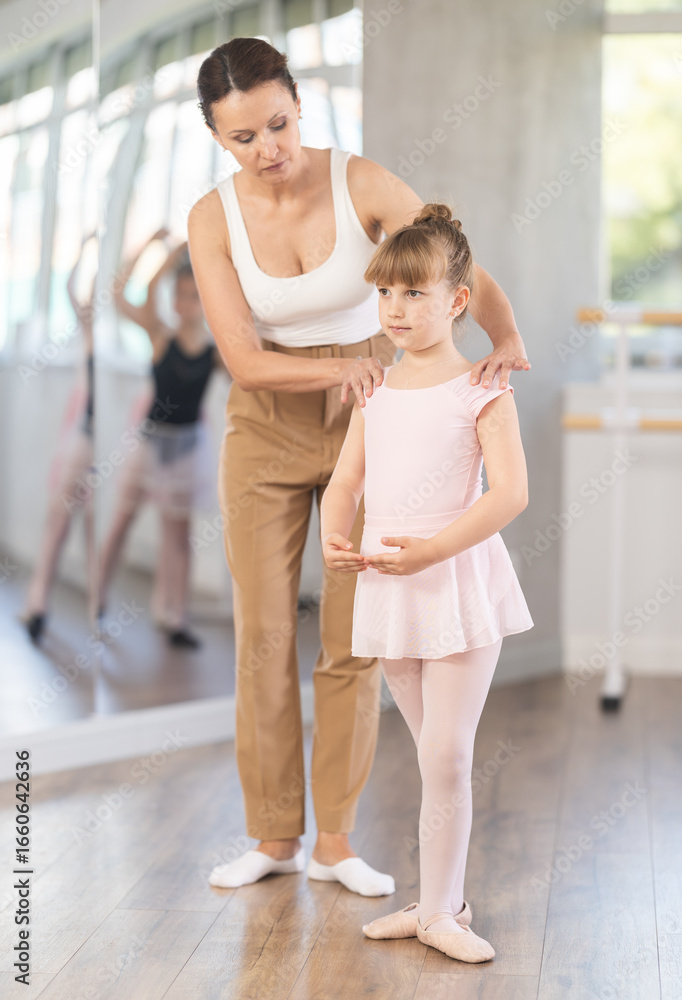 During ballet training, teacher corrects student, teaches her to keep posture correctly and beautifully, perform dance elements.