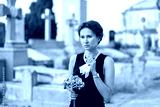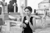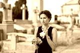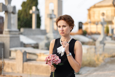 Elegant grieving woman in black dress and pearl necklace holding flowers in cemetery, surrounded by tombstones and crosses, reflecting sorrow and loss..