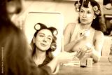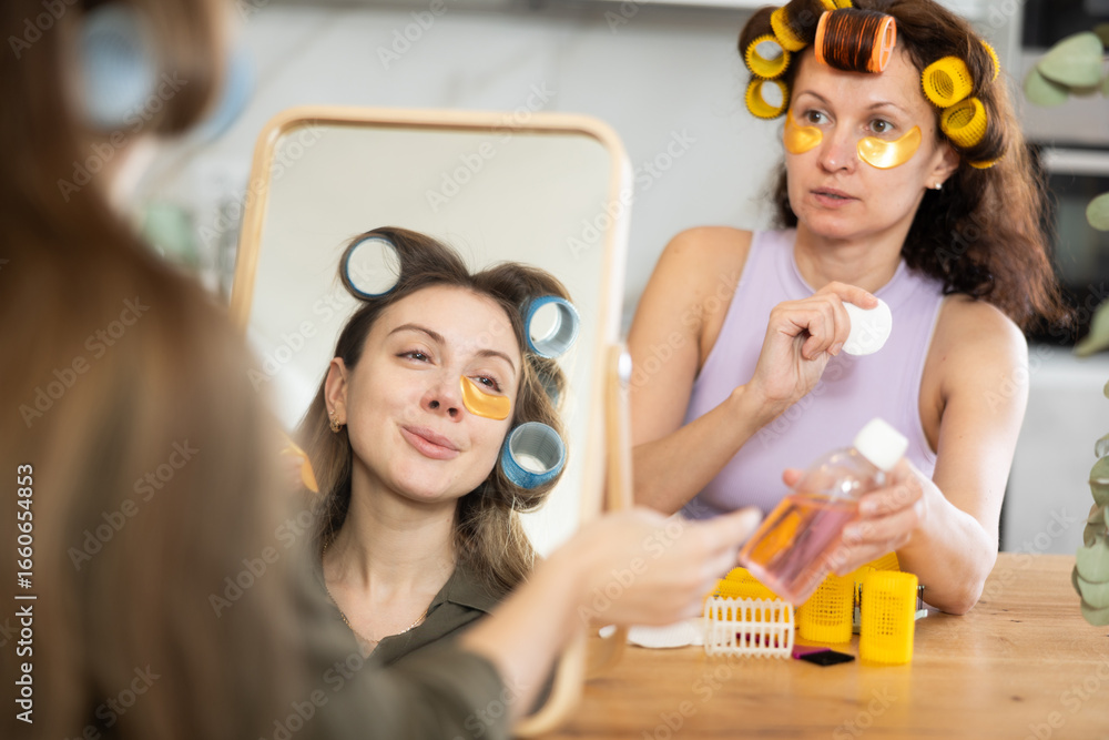 In front of vanity mirror, woman with best friend with hair rollers on heads enjoying skincare routine, experimenting with eye patches and sharing beauty tips