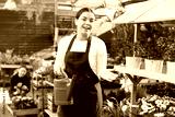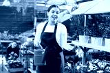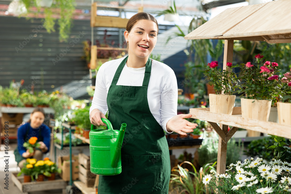 smiling employee of flower greenhouse stands with watering can near shelf with garden plants