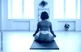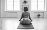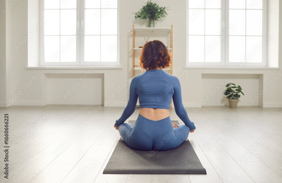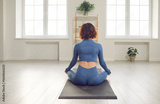 Yogi girl in yoga lotus pose rear view, slim woman practicing yoga or working out, wearing sport wear indoor, yoga studio, home, feeling contemplation, sitting to meditate on white floor mat alone