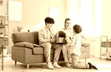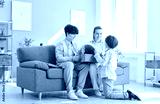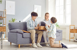 Happy mother with little and teen son unpacking new parcel delivered at home sitting on couch together, smiling woman mom and boy children enjoy having fun with gadget, getting present on weekend