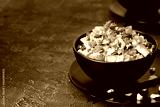 Stir fried tofu, cashew, chili on dark background. Copy space