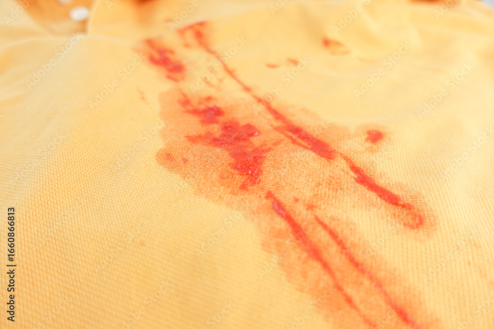 Red stain on yellow fabric from food spill during lunch