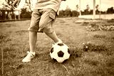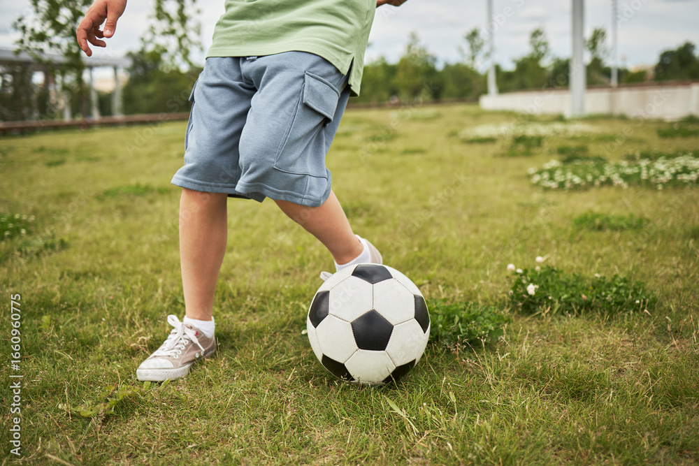 Caucasian child standing on grass field controlling soccer ball with foot, wearing shorts and sneakers, outdoor activity, summer day, playing sports