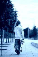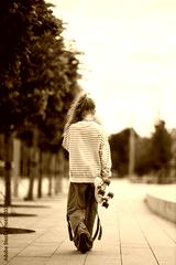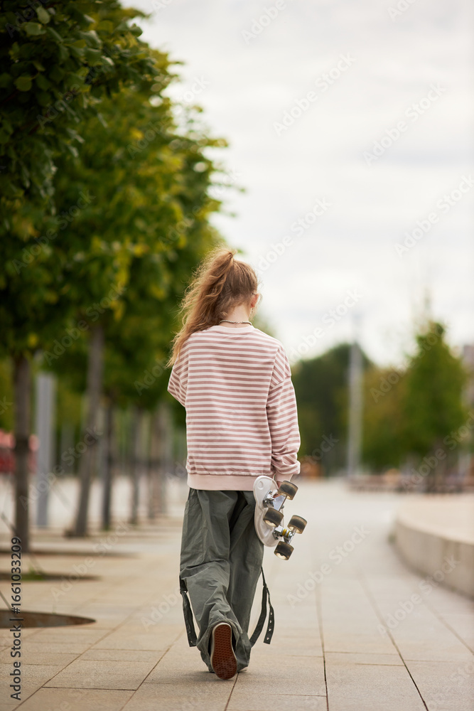 Caucasian girl walking outdoors holding skateboard in right hand, long hair tied back, wearing casual clothing, moving along paved path lined with green trees