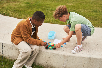 Two boys, one Black and one Caucasian, sitting outdoors on concrete edge building geometric structure with colorful plastic pieces, both appearing focused and engaged in activity