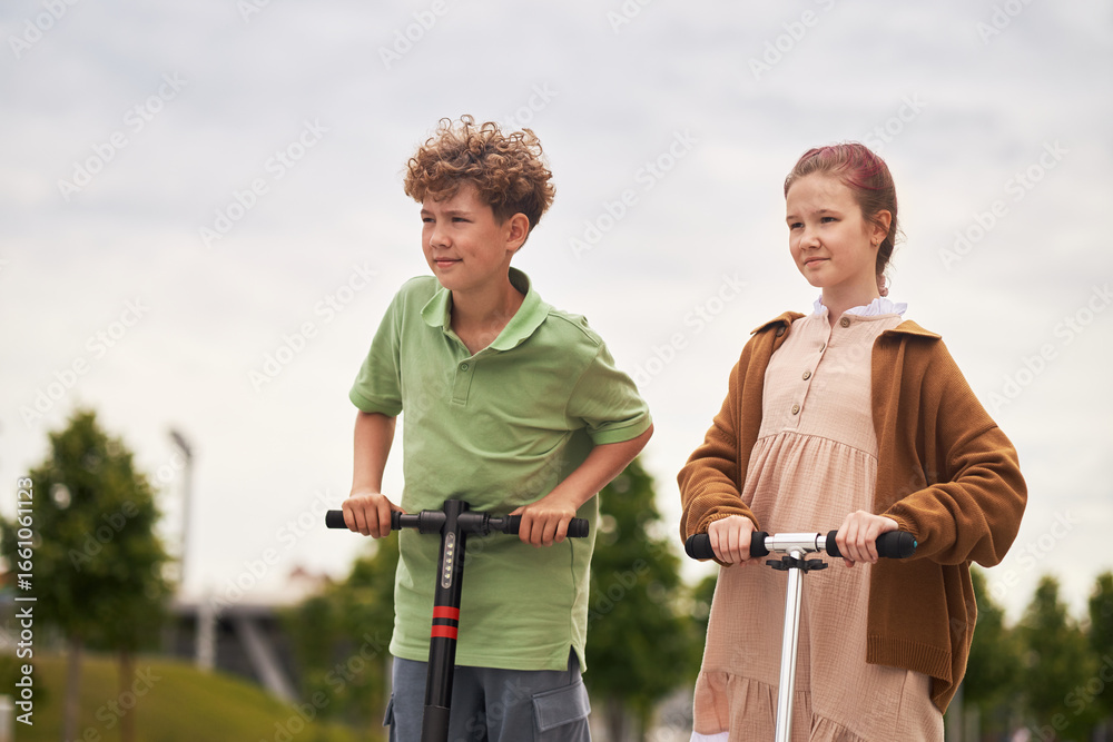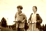 Caucasian boy and Caucasian girl riding scooters outdoors, looking ahead with focused expressions, trees and sky visible in background, casual activity