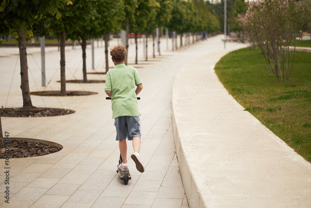 Caucasian boy riding scooter along paved walkway in urban park, moving away from camera, surrounded by trees and greenery, demonstrating active outdoor lifestyle