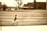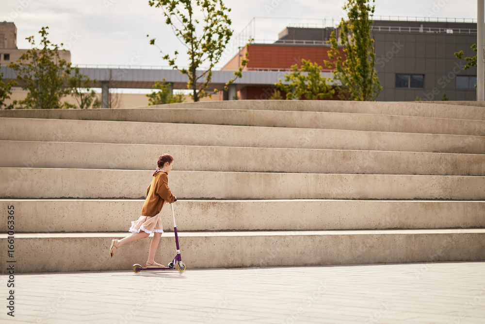 Teenage Caucasian girl riding scooter outdoors near concrete steps, moving quickly with one foot on scooter and other foot pushing off ground, urban background