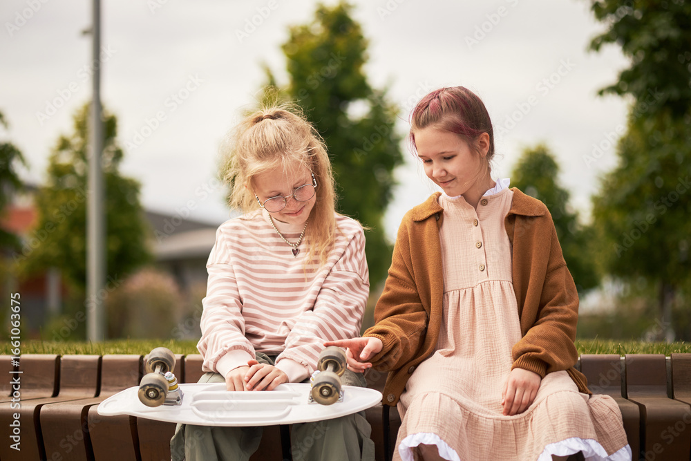 Two Caucasian girls sitting on bench, one girl holding skateboard while other girl pointing at skateboard wheels, both children smiling and interacting in park setting