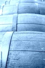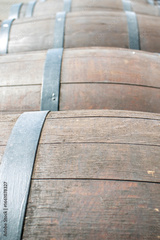 Oak barrels stand in two rows to the horizon. Wooden barrels tied with steel hoops in the sun. Metal and natural wood of wine barrels, perspective view.