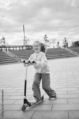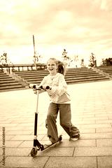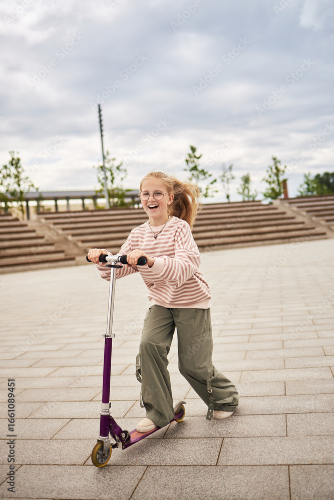 Caucasian girl riding scooter outdoors, smiling and looking forward, wearing glasses, enjoying active movement on paved urban plaza with steps in background