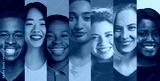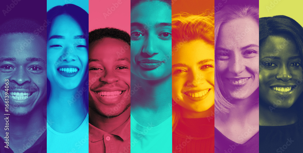 Artistic lineup of diverse people with positive emotion in multicolor gradient portrait style. Concept of creativity, diversity, inclusion, optimism, teamwork, society, connection and global unity.