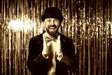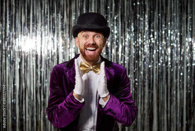 Portrait of a amazed and happy man applauding, radiating surprised fun, enjoying entertainment at a party, expressing pleasure on a glittery background in a lively celebration setting with joy.