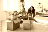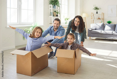 Joyful family having fun in new apartment as children pretending to fly in cardboard boxes while parents pushing them. Cheerful father, mother and kids celebrating purchase of new home and relocation.