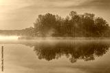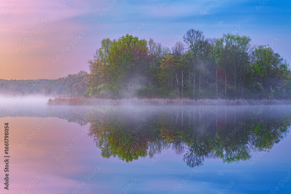 Spring landscape at dawn of the shoreline of Whitford Lake, with mirrored reflections in calm water, Fort Custer State Park, Michigan, USA