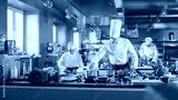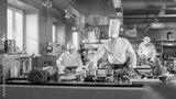 Famous Chef Works in a Big Restaurant Kitchen with His Help. Kitchen is Full of Food, Vegetables and Boiling Dishes.