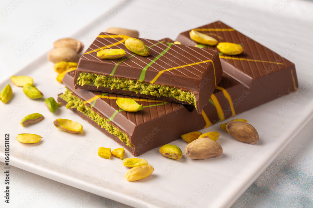 Trendy chocolate; Dubai chocolate is made with pistachio paste and kadayif.