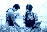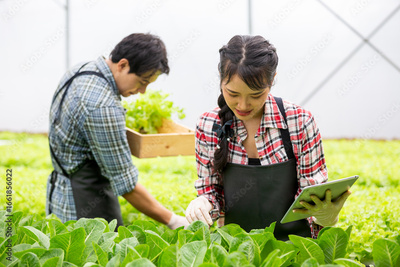 Asian farmers using digital tablet for smart farming and harvesting and Check quality fresh organic vegetables in greenhouse. Modern agriculture, innovation and sustainable food production concept.