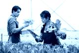 Asian woman smart farmer using digital tablet to inspect organic vegetable crops while working in greenhouse, demonstrating innovation and precision farming in sustainable agriculture.