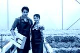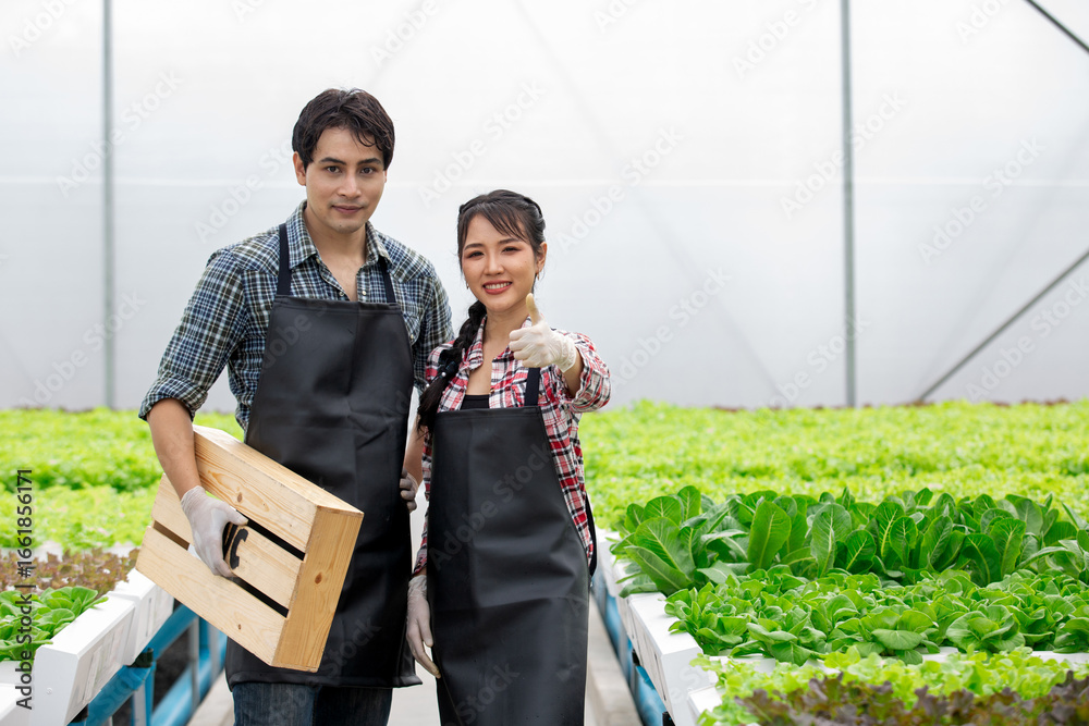 Confident Asian farmers standing in a smart greenhouse with fresh organic vegetables, smiling and showing thumbs up, representing success in modern farming and sustainable agriculture.