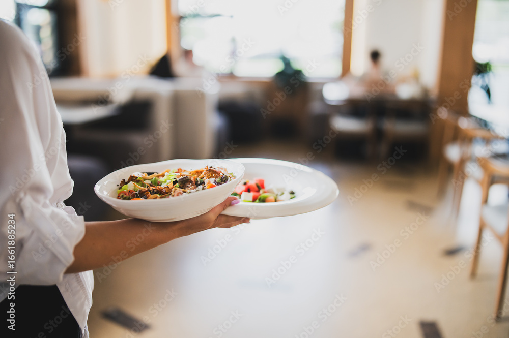 Waiter in white shirt serving two plates with gourmet food and fresh salad in a bright, modern restaurant interior. Selective focus on dishes