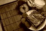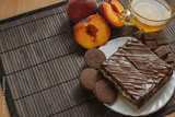 Cake with a cup of tea on a dark wooden background.Dessert of cottage cheese in chocolate glaze