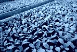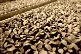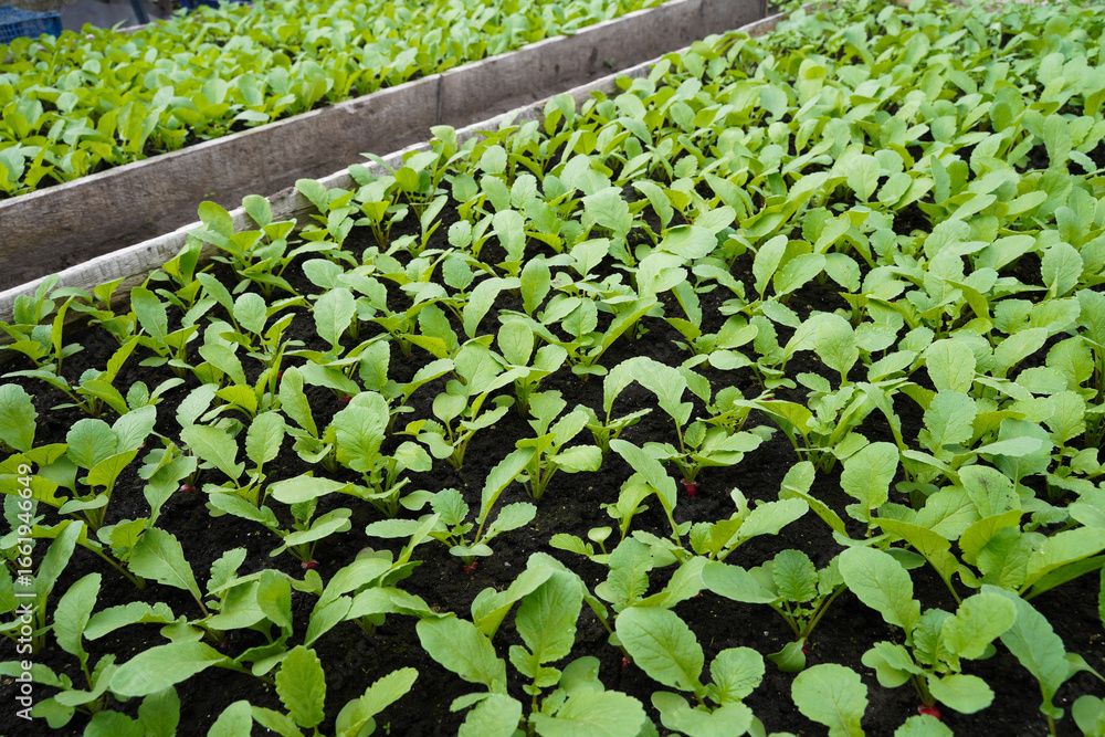 Powerful young radish seedlings. Growing natural red radish in a greenhouse.
