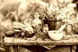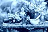 Fresh herbs from the garden and the different types of oils for massage and aromatherapy.