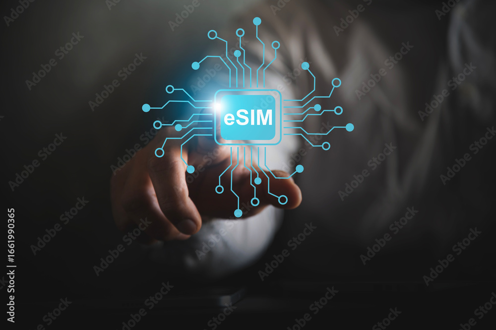 A person pointing at a glowing digital eSIM icon with circuit connections, symbolizing embedded SIM technology, mobile connectivity, eSIM Technology and Digital Connectivity Concept.